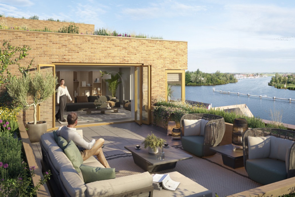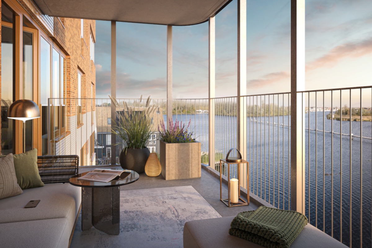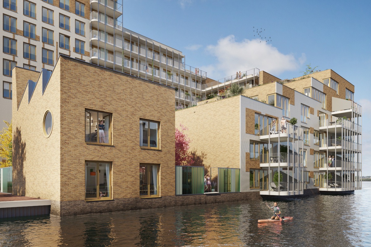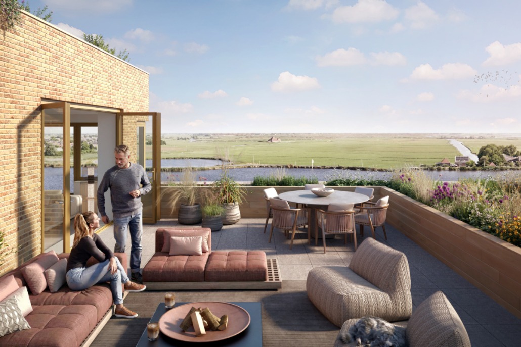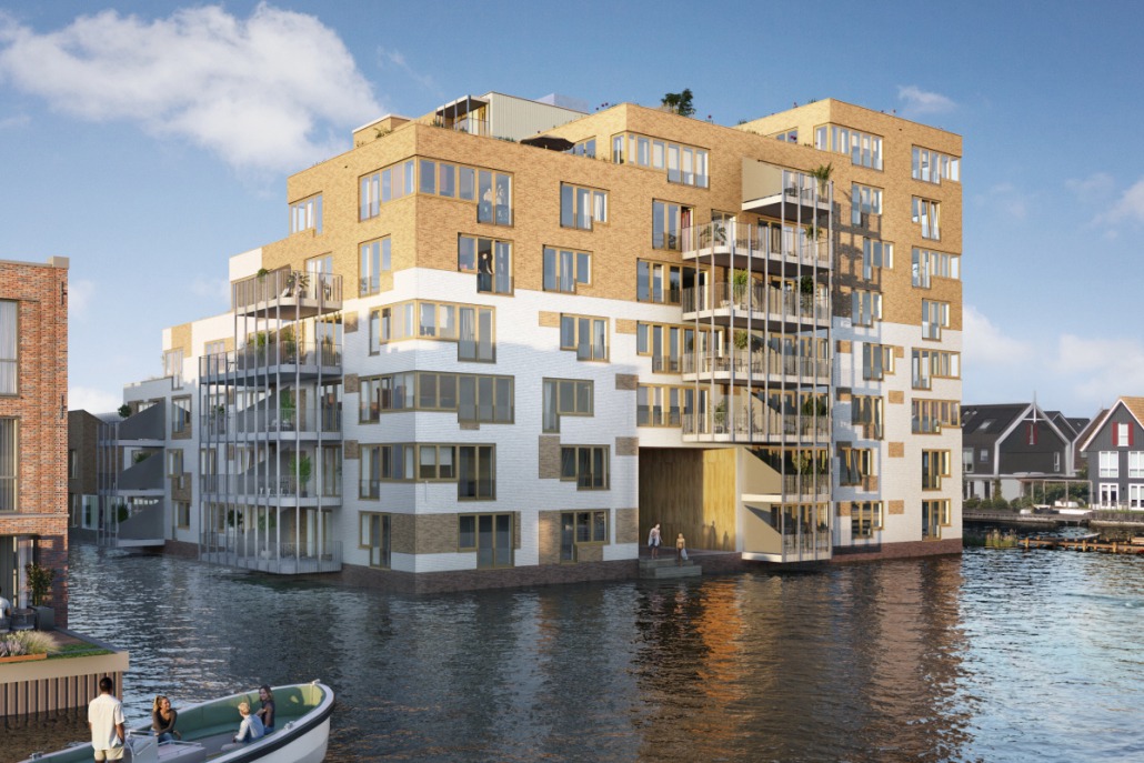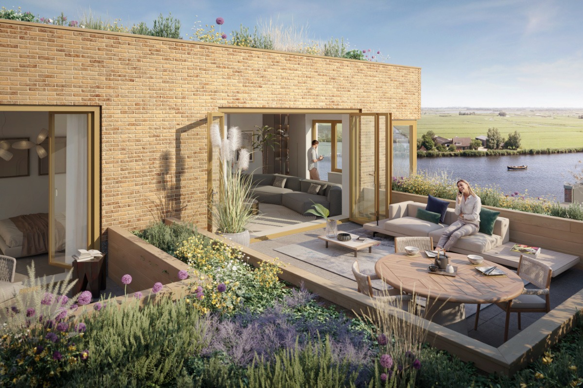 Het woonprogramma bestaat uit appartementen met royale plattegronden en grote raampartijen, gericht op het water en het omliggende landschap. De atelierwoning vormt een bijzondere toevoeging aan het plan en wordt gerealiseerd over de begane grond en eerste verdieping. Deze woning wordt uitgevoerd in CLT (Cross Laminated Timber / kruislaaghout) en biedt een combinatie van wonen en werken op één plek.